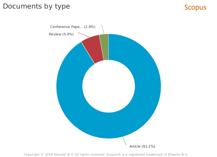 La mayoría de documentos publicados son en el 91.2% artículos, reportados 31 artículos en una ventana de observación de 18 años, 5.9% review y 2.9% conferencias, como se presenta en la Figura 5. Se resalta como se ha dicho en este trabajo, que es un tema de investigación cuyo interés ha estado en aumento.