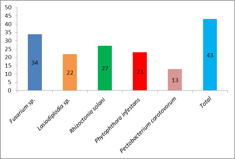 De la amplia gama de microorganismos fitopatógenos que afectan a los cultivos de plantas, los grupos que más enfermedades ocasionan son los hongos y las bacterias, causando pérdidas que ascienden a miles de millones de dólares al año (Cristóbal et al., 2013). Entre los patógenos más importantes de la papa, se resaltan el cromista Phytophthora infestans, el hongo Rhizoctonia solani y las bacterias del género Pectobacterium (Pérez et al., 2015).
