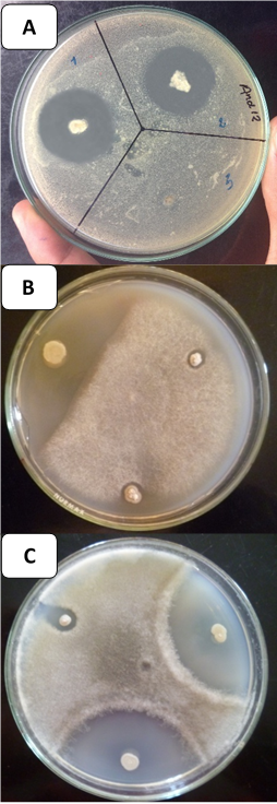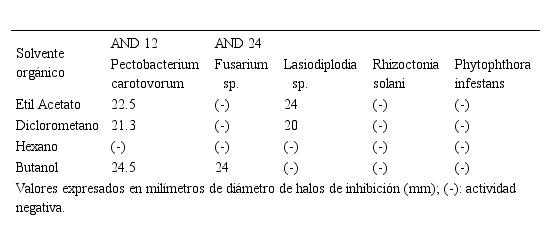Actividad antimicrobiana de los extractos orgánicos. Las cepas AND 12 y AND 24 fueron seleccionadas para esta evaluación, lo que se explica por el mayor valor de capacidad antagonista porcentual mostrada frente a los fitopatógenos en estudio (Tabla 3).
