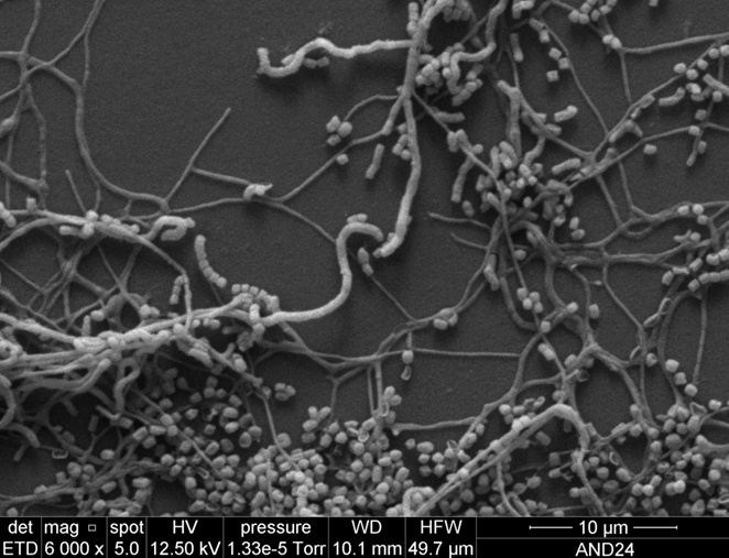 Microscopía electrónica de actinomicetos seleccionados. La mayoría de cepas observadas por microscopía óptica presentaron un patrón morfológico similar, razón por la cual se procedió a la observación por microscopía electrónica de uno de ellos, el actinomiceto cepa AND 24, en el que se pudo notar la presencia de hifas con adecuada turgencia que se ramifican y dan origen a cadenas cortas de esporas dispuestas en forma espiral (Figura 3), de manera análoga a lo observado en las láminas por el método de microcultivo, con lo que se confirmó que el actinomiceto aislado se trata de una cepa de Streptomyces sp.