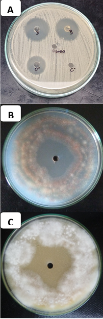 Determinación de la actividad antimicrobiana de los extractos orgánicos. Se realizó, según las pautas seguidas por Pérez et al. (2015), realizándose pruebas por duplicado. El extracto orgánico recuperado y resuspendido en DMSO se colocó en pocillos de 5 mm de diámetro generados sobre el medio Agar Tripticasa Soya (TSA) para P. carotovorum, Agar Centeno para P. infestans, y Agar Papa Dextrosa (APD) para los hongos fitopatógenos, donde previamente fueron sembrados los respectivos fitopatógenos. Las placas fueron incubadas a 28 °C durante 48 horas en el caso de P. carotovorum, mientras que el cromista y los hongos se incubaron durante 7 días. La actividad antimicrobiana se determinó por la medida del halo de inhibición (mm de diámetro) según lo descrito por Pandey et al. (2011).