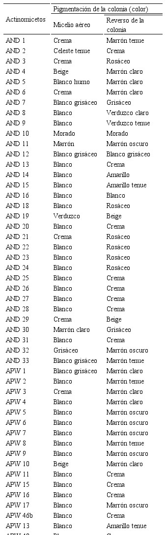 Análisis macroscópico y microscópico de actinomicetos seleccionados. Los actinomicetos fueron caracterizados por su superficie, forma y tamaño de colonia, así como la producción de pigmentos. Para la identificación microscópica se realizaron microcultivos según Franco-Correa et al. (2010) y observaciones del micelio aéreo y vegetativo, fragmentación del micelio, agrupación de esporas, entre otras, para compararlas con las descritas en el Manual de Determinación Bacteriológica de Bergey (Goodfellow et al., 2012). Una cepa seleccionada fue sometida a la observación por Microscopía Electrónica de Barrido (InspectTM S50 marca FEI).