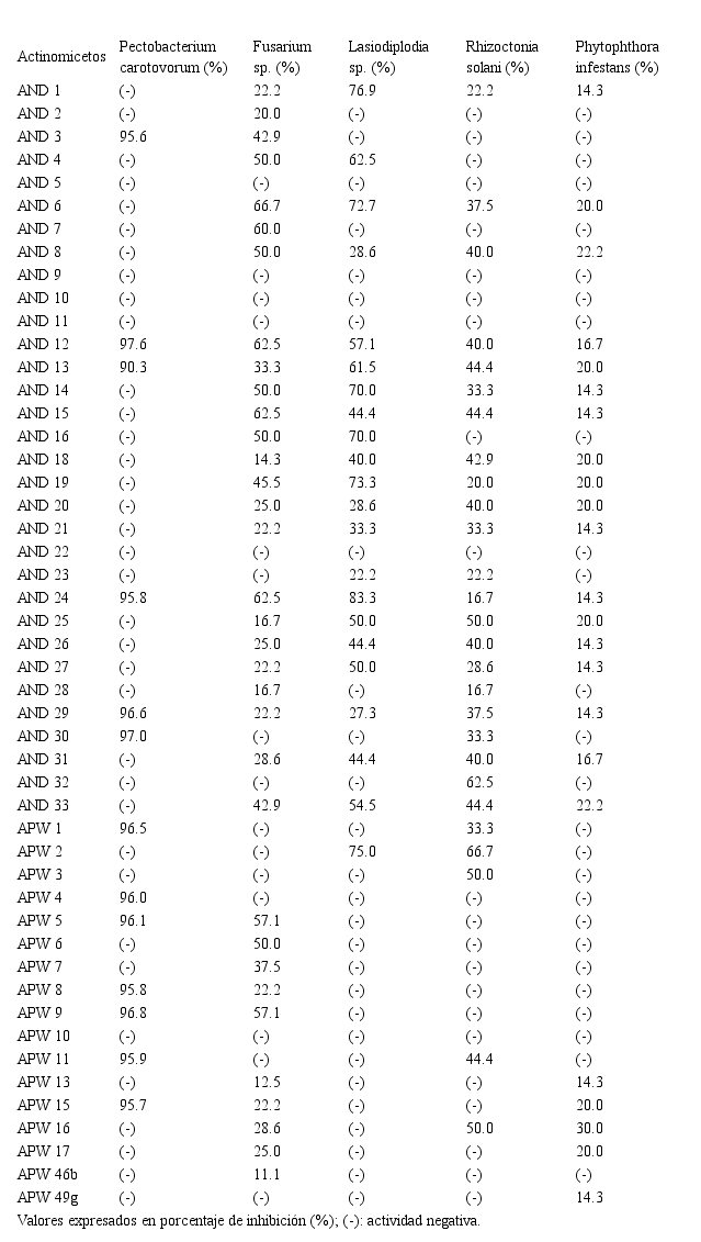 Actinomicetos antagonistas frente a fitopatógenos de la papa. Del total de actinomicetos aislados, el 87.8% (43 actinomicetos) presentó capacidad antagonista al menos frente a uno de los microorganismos fitopatógenos ensayados (Figura 1), caracterizado por un halo visible a simple vista entre actinomiceto y patógeno, con un porcentaje de inhibición mayor al 10%, según lo indicado por Ahmed et al. (2007). Los resultados individuales por cada cepa se pueden observar con detalle en la Tabla 2.