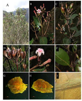 Cinchona officinalis se caracteriza por su porte arbustivo (≤ 6 m), con ramas pubérulas cuando son juveniles y glabras a subglabras cuando son adultas, estípulas interpeciolares con coléteres dispuestos en varias filas, hojas elípticas de consistencia coriácea cuando están frescas y cartácea cuando se secan, domacios en el envés de las hojas profusamente huecos con pelos en los márgenes, inflorescencias terminales congestas, cáliz con lóbulos que alcanzan más de la mitad de su longitud, corolas de color rosado con lóbulos densamente vilosos en el interior, cápsulas cilíndricas con dehiscencia acropétala y semillas diminutas aladas de borde entero a ligeramente dentado (Figura 2).