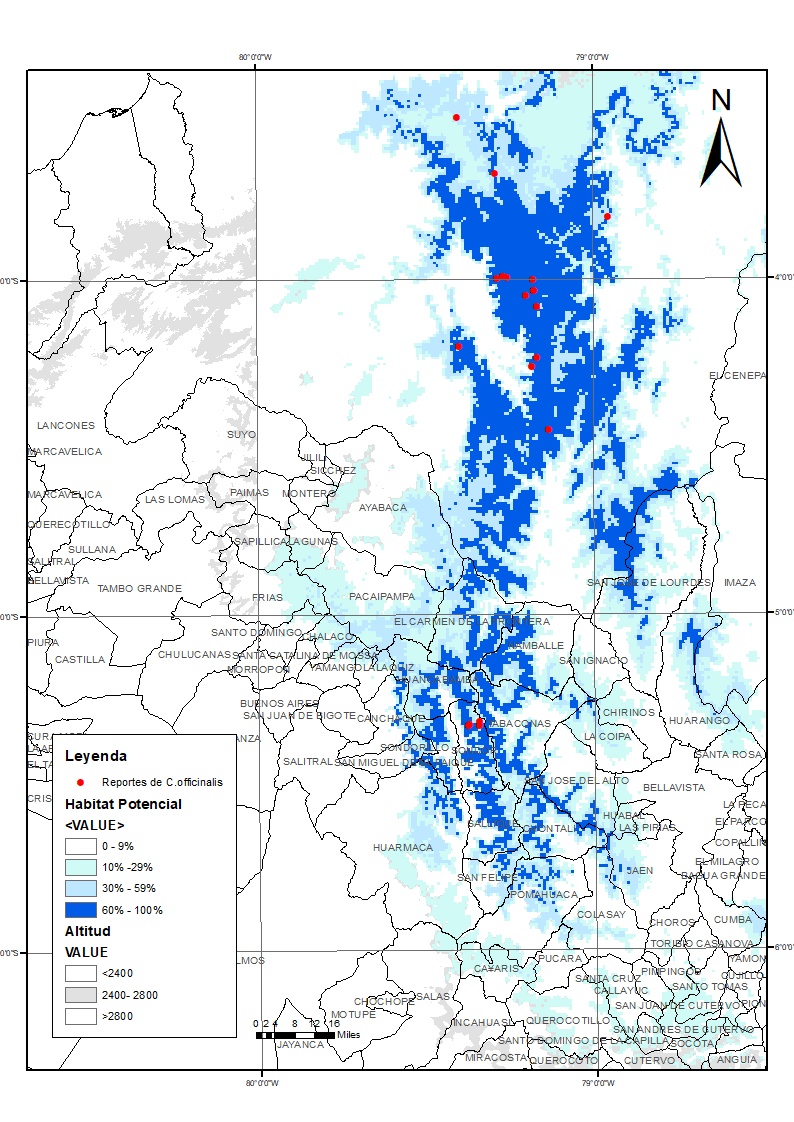 El modelamiento preliminar (AUC = 0.994) que consta de 18 puntos de ocurrencia de la especie para el sur de Ecuador, sugirió nichos potenciales situados en el norte del Perú, específicamente en los departamentos de Piura y Cajamarca. Diez variables climáticas y la elevación han permitido identificar que el hábitat donde se desarrolla adecuadamente la especie es en ambos departamentos, y no en otros departamentos del Perú, como si lo hacen las demás especies del género Cinchona. Posteriormente, un modelamiento más detallado que incluye cinco nuevos reportes de ocurrencia (Caserío Cruz Chiquita y Shilcaya) en el Perú (AUC = 0.997), mostró nichos más restringidos para la especie en varias localidades de los mismos departamentos (Figura 3). Observaciones de campo y análisis de exsicatas demostraron la existencia de C. officinalis en las localidades de Cruz Chiquita y Shilcaya, pertenecientes al distrito de Sóndor, provincia de Huancabamba, departamento de Piura, corroborando así las inferencias del modelamiento en las áreas de mayor ocurrencia. El modelamiento también indica que existen hábitats adecuados para la especie en los distritos de Sallique, Tabaconas, Namballe, San José de Lourdes, (Cajamarca), y en los distritos de Sondorillo, Carmen de la Frontera y Huancabamba (Piura) (Figura 4). De confirmarse la presencia de poblaciones en posteriores estudios, la categoría disminuiría a Vulnerable (VU B1b (iii); B2b (ii, iii); C2a (i)), ya que podría ubicarse dentro de áreas protección como Bosques de Montanos y Páramos de Huaricancha y del Santuario Nacional Tabaconas-Namballe.