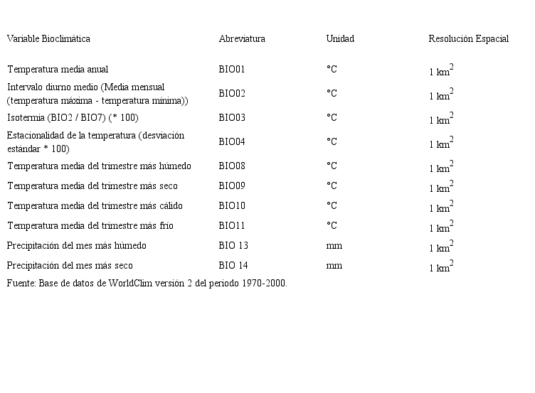 Fue obtenido a partir de los 23 puntos de ocurrencia y 10 variables bioclimáticas en formato raster de 1 km. de resolución (Hijmans et al., 2005). Ambos datos fueron analizados con el algoritmo Maxent v.3.4.1 (Phillips et al., 2006), debido a su alta capacidad predictiva con pocos registros de presencia (Elith et al., 2006; Hernández et al., 2006; Pearson et al., 2007; Sarkinen et al., 2013). Las variables climáticas usadas fueron previamente seleccionadas con el coeficiente de correlación de Spearman (r < 0.8) (Dormann et al., 2013) (Tabla 2). La validez del modelo fue evaluado acorde a las curvas de respuesta (análisis de omisión/comisión) y sensibilidad Curva Operada por el Receptor (ROC)-Área Bajo la Curva (AUC) (Elith et al., 2006; Aguirre & Duivenvoorden, 2010) y pruebas Jackknife para medir el efecto de cada variable en el modelo (Hijmans et al., 2005; Ramos-Dorantes et al., 2017). El modelo obtenido en MaxEnt fue reclasificado en ArcMap 10.2, para obtener superficies en los diferentes niveles de probabilidad y con ello obtener el perfil bioclimático de la especie. Finalmente, la superposición del perfil bioclimático con otras variables como altitud y cobertura vegetal permitieron obtener una delimitación más acertada del hábitat potencial de la especie, ya que hay áreas donde la especie no podría encontrarse, tales como: áreas desprovistas de cobertura y elevaciones mayores a 2 800 m.