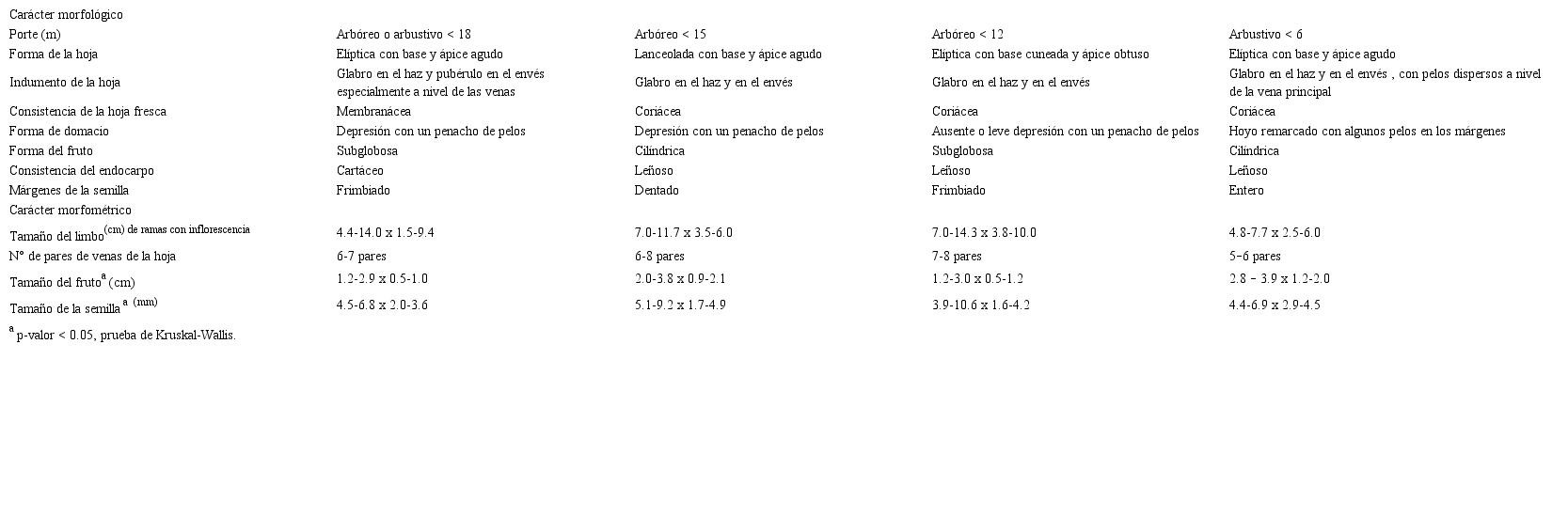 Se analizaron doce caracteres obtenidos a partir de las descripciones de Andersson (1995a, 1998) (Tabla 1). Cabe precisar que la descripción de los caracteres ha sido complementada con observaciones de muestras vivas y herborizadas. Se examinaron 200 ejemplares colectados en campo, de los cuales 50 correspondieron a cada especie (C. officinalis, C. capuli, C. lancifolia y C. macrocalyx). Los caracteres de indumento de la hoja, forma de domacio y márgenes de la semilla fueron observados en estereoscopio, mientras que el tamaño de limbo, tamaño del fruto y de la semilla fueron medidos en el programa ImageJ 64bits (Schindelin et al., 2012) (Figura 1). Para la determinación de las diferencias de los caracteres entre las especies, se empleó la prueba estadística de Kruskal-Wallis. Esta prueba es muy empleada en estudios de morfometría (Rohlf, 1990; Martínez et al., 2019), ya que permite identificar diferencias en la distribución de caracteres entre especies; y es calculada mediante la función kruskal.test del stats R Package (Hollander et al., 2013). Adicionalmente, el análisis de cluster mostró la similitud de caracteres entre las especies.