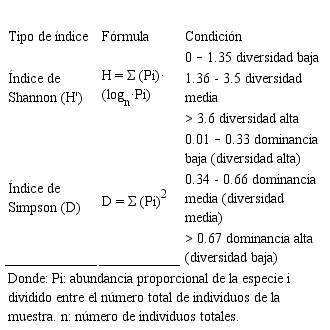 Se determinó la diversidad alfa (α) de los transectos mediante el índice de diversidad de Shannon-Wienner (H', estima la heterogeneidad de la comunidad considerando su abundancia), el cual se representó en unidades nats por individuo (nats/ind) y el de Simpson (D, que destaca la representatividad de especies raras del resto) (Moreno, 2001; las fórmulas se muestran en la Tabla 2). Se estimó la diversidad beta mediante el índice de Whittaker para conocer la propiedad de reemplazo en las comunidades vegetales (Moreno, 2001; Koleff et al., 2003) según Fórmula 1.