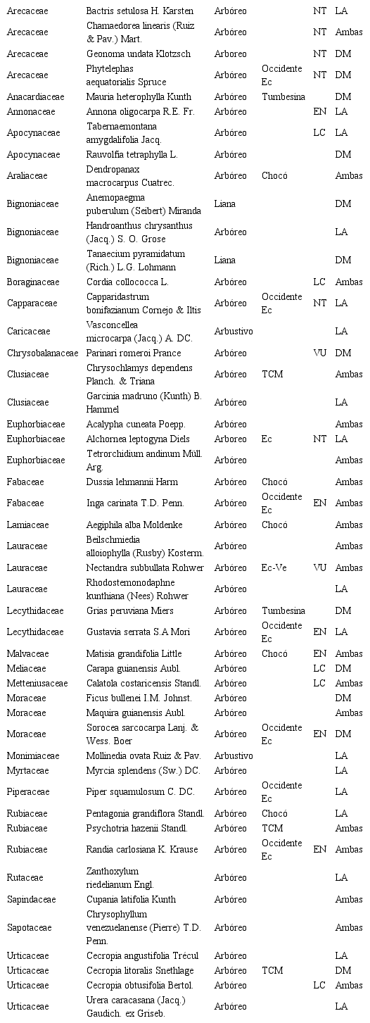 Se registraron 19 especies endémicas (40%), de estas 11 son compartidas y 8 a nivel nacional. El endemismo compartido fue extendido para el punto caliente de biodiversidad Tumbes-Chocó-Magdalena (TCM) con tres especies, para el Chocó cinco especies, para la región Tumbesina dos especies y Nectandra subbullata compartida con Venezuela. El endemismo para el Ecuador (Ec), incurrió en la especie Alchornea leptogyna acompañada de siete especies para el occidente ecuatoriano (Tabla 1). Se anotaron 19 especies (40%) en alguna categoría de amenaza, donde seis están En Peligro (EN), dos como Vulnerable (VU), seis como Casi Amenazada (NT) y cinco como de Preocupación Menor (LC) (Tabla 1). Las especies más importantes para conservar, debido a su estado EN y por ser endémicas fueron Inga carinata “Guaba”, Gustavia serrata “Membrillo”, Sorocea sarcocarpa “Tillo” y Randia carlosiana “Cañafito”.