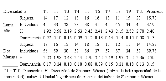 La riqueza específica fue mayor para Loma Alta con 36 especies y menor para Dos Mangas con 31 especies; mientras tanto la abundancia fue inversa, menor para Loma Alta con 379 individuos y mayor para Dos Mangas con 390 individuos. La diversidad alfa promedio para los bosques de garúa de Loma Alta y Dos Mangas oscila en rangos medios (Tabla 2); aunque, Loma Alta obtuvo el valor promedio más alto (H=2.40 nats/ind) comparado con el de Dos Mangas (H=2.30 nats/ind) (Tabla 3). La dominancia medida a través del índice de Simpson presentó un patrón inverso a la diversidad con valores en el rango bajo (Tabla 2), siendo los valores promedio 0.13 para Loma Alta y 0.15 para Dos Mangas (Tabla 3).