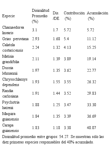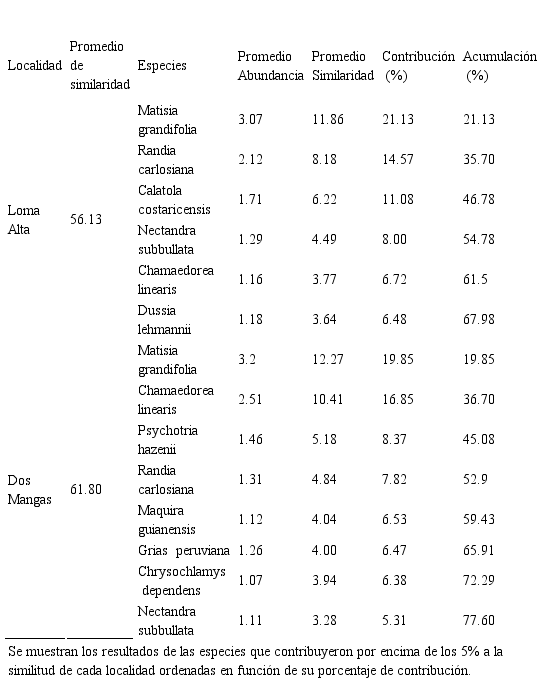 El análisis mediante el índice de Whittaker mostró que la tasa de recambio es mayor (1.29) en Loma Alta y menor (1.09) en Dos Mangas. En cuanto a la similaridad de los bosques, en el dendrograma se observó la formación de dos grupos y cada uno representa a una localidad (Figura 4). El análisis de ordenación espacial nMDS mostró, igualmente, dos grupos separados según el bosque (Figura 5); la prueba de ANOSIM mostró diferencias entre estos grupos (R = 0.80, p < 0.01). El análisis SIMPER mostró que las especies responsables de esta diferencia fueron Chamaedorea linearis “Palmito”, Grias peruviana “Aguacatillo” y Catalatola costaricensis “Palo de Pija” que juntas contribuyen al 15% en disimilitud (Tablas 4 y 5).