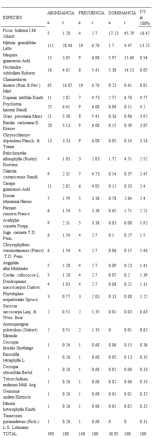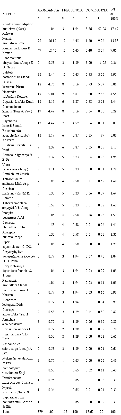Se diferenciaron tres estratos (e.g., arbóreo, arbustivo y herbáceo) en ambas localidades. En Loma Alta, la estructura estuvo conformada por una vegetación densa (3 790 individuos/ha), donde se detectaron dos estratos, el arbóreo y arbustivo. El estrato arbóreo presenta un dosel discontinuo, donde el 16% de los individuos alcanzan los 20 m y el 84% con alturas promedio de 7.26 m y un área basal promedio de 0.04, representado por especies como Matisia grandifolia, Randia carlosiana y Calatola costaricensis; mientras tanto, el estrato arbustivo es caracterizado por Psychotria hazenii y árboles regenerantes de la especie Matisia grandifolia. Se registraron las especies más abundantes tales como Matisia grandifolia (Ar = 26%), Randia carlosiana (Ar = 12%) y Calatola costaricensis (Ar = 8%), las cuales alcanzaron el 46% de la abundancia y se encontraron distribuidas en las diez parcelas; no obstante, sólo la especie Rhodostemonodaphne kunthiana acumuló el 50% de la dominancia en esta área (Tabla 6). Las cinco especies ecológicamente representativas según el IVI fueron Rhodostemonodaphne kunthiana (18%), Matisia grandifolia (14%), Randia carlosiana (7%), Handroanthus chrysanthus (6%) y Calatola costaricensis (6%) (Tabla 6).