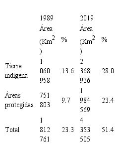 La mejor noticia para la conservación de insectos en el Amazonas es el aumento considerable de la porción del bioma que ahora se incluye en áreas protegidas que en teoría están manejadas. También es importante mencionar la expansión de las tierras indígenas oficialmente reconocidas. Como se muestra en la Tabla 1, en los últimos 30 años la superficie del bioma amazónico bajo algún tipo de protección legal se ha más que duplicado, pasando de 1.81 millones de kilómetros cuadrados a 4.35 millones de kilómetros cuadrados. Hoy más de la mitad del bioma amazónico está protegido legalmente in situ. Las áreas protegidas generalmente tienen infraestructura y equipos básicos y están guardadas por guardaparques y la mayoría de ellas tienen al menos un profesional residente. Los territorios indígenas son defendidos por sus miembros y reciben apoyo gubernamental cuando es necesario.