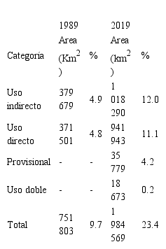Como se muestra en la Tabla 2, la proporción de área protegida por cada grupo de categorías es equivalente. La mejor garantía de una conversación a largo plazo es, obviamente, proporcionada por las categorías más estrictamente protegidas agrupadas como "uso indirecto", que cubren solo el 12% del bioma amazónico. Sin embargo, a largo plazo, esto no es del todo seguro, ya que algunas áreas protegidas de ambos grupos a menudo son sometidas a procesos de eliminación, reducción y degradación, lo que es un problema que es particularmente importante en Brasil, especialmente a nivel de áreas protegidas estatales (Pack et al., 2015).