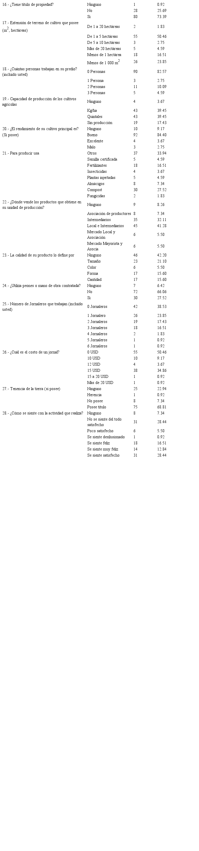 En la Tabla 3 se indica que el 73.39% posee título de propiedad. El 50.46% posee una superficie de cultivo de 10 000 a 50 000 m., seguido del 23.85% que posee una extensión menor a 1 000 m.. El mayor porcentaje de las UPA, no tienen personas del núcleo familiar que ayuden en las labores de la finca con un 82.57%. Los productores cuantifican su producción en quintales (bultos de 50 kg), en un 39.45%. La percepción de una producción buena es de 84.40%. El 16.51% usa fertilizantes y solo un 4.59% utiliza semilla certificada.