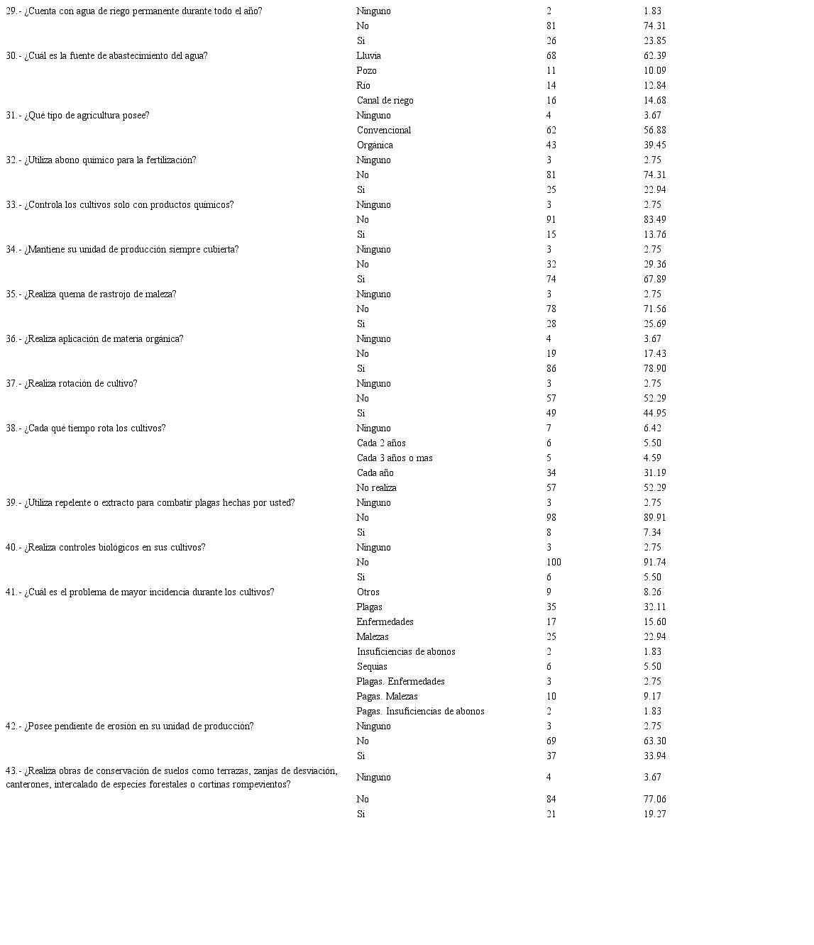En la Tabla 4 se observa que el 39.45% de los productores se definen como agricultores orgánicos, el 44.95% manifiesta realizar rotaciones de cultivo. El 62.39% espera las lluvias para el abastecimiento de agua en los cultivos. El 32.11% y el 15.60% manifiestan perdidas en sus cultivos por problemas de plagas y enfermedades respectivamente. El 19.27% manifiesta realizar actividades de conservación del ambiente.