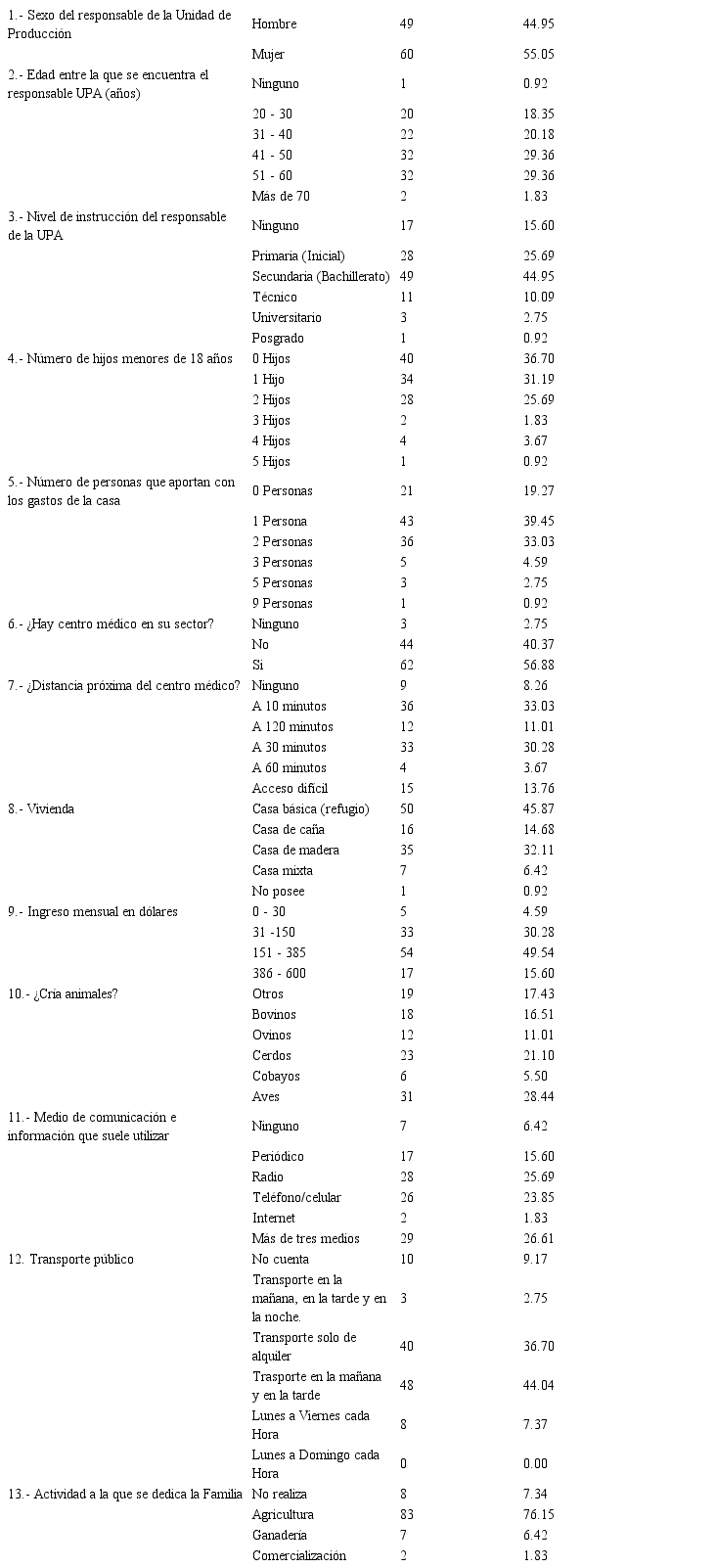 La responsabilidad del manejo de las UPA está a cargo en un 55.05% de mujeres (Tabla 2) La mayoría de los responsables se ubican en un rango de edad de 41 a 50 años con el 29.36%, al igual que el rango de 51 a 60 años, que también representa el 29.36% del total de la muestra; las personas con edades entre 31 a 40 años representan el 20.18%, mientras el 1.83% de los responsables forman parte del grupo de la tercera edad. Referente al nivel de instrucción de los responsables de las UPA, el 15.60% no posee ningún nivel académico, el 25.69% ha recibido instrucción primaria, el 44.95% secundaria y el 2.75% estudios universitarios.