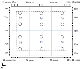 El campo evaluado fue dividido en 6 sectores (S), considerando la pendiente y los bloques de irrigación (Figura 1). Se instalaron 12 trampas (dos por cada sector, colocadas sobre el “lomo del surco”) uniformemente distribuidas y distanciadas unas de las otras por lo menos 75 metros, y alejadas de los márgenes del campo al menos 10 metros para evitar el ‘efecto borde’ (Leather, 2005).