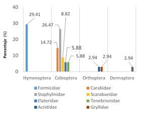 El orden Coleoptera tuvo mayor número de morfoespecies (61.76%) con respecto a los órdenes Hymenoptera (29.41%), Orthoptera (5.88%) y Dermaptera (2.94%) (Figura 2).