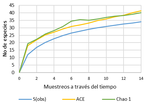 La riqueza específica fue calculada mediante estimadores no paramétricos Chao1 y Abundance-based Coverage (ACE), los cuales están basados en datos de abundancia de especies (Gotelli & Colwell, 2011). Estos estimadores fueron obtenidos mediante el software “Estimate-S 9.1” (Colwell, 2013) para elaborar curvas de acumulación de especies y calcular los esfuerzos de muestreo, comparando la riqueza específica estimada con la riqueza de especies observada.