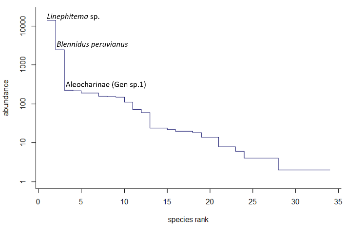 Al analizar la curva de rangos de abundancia (Figura 4), se observa una muy baja proporción de especies con una alta dominancia. Examinando la composición de la entomofauna colectada, se encontró que esta porción corresponde a tres morfoespecies (Linephitema sp., Blennidus peruvianus y Aleocharinae Gen. sp.1) las cuales en conjunto corresponden al 91.8% de la abundancia total de la comunidad colectada. La porción restante de la curva muestra un cambio en su pendiente, siendo esta mucho menos pronunciada, lo que corresponde a las especies más equitativamente distribuidas en la comunidad.