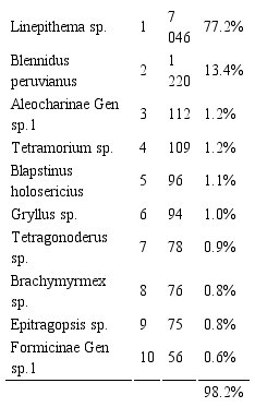 Los rangos de abundancia proporcional de las 10 especies más abundantes son presentados en la Tabla 2, en la cual contrastan Linepithema sp. (Hymenoptera: Formicidae) y Blennidus peruvianus (Coleoptera: Carabidae) como las más abundantes, correspondiendo al 90.6% del total de individuos colectados.