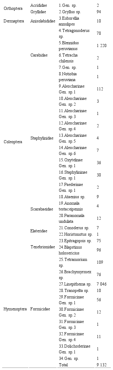 Los órdenes Hymenoptera y Coleoptera fueron los más abundantes, representados principalmente por Linepithema sp. (Fam. Formicidae) y Blennidus peruvianus (Fam. Carabidae), respectivamente.