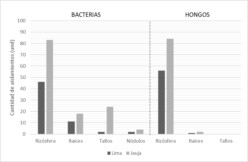 Se obtuvieron en total 333 cultivos puros, de los cuales 190 eran de bacterias y 143 de hongos (Figura 1). La mayoría de los aislados provenían de la rizósfera (80.8%, 269), sólo un 19.2% (64) eran potenciales endófitos de tarwi porque fueron encontrados dentro de tallos, raíces y nódulos. Al ser la rizósfera una zona de interacción con la planta, los microorganismos encuentran en ella un ambiente favorable con nutrientes orgánicos provenientes de las raíces, y esto conlleva a que la concentración de microorganismos en la rizósfera generalmente sea mucho mayor que en el resto del suelo (Glick, 1995). Este resultado es comparable con estudios como el de Angulo et al. (2014) y Ayubb et al. (2017), quienes también obtuvieron mayor cantidad de aislados rizosféricos que de endófitos a partir de Eucalyptus nitens y Oriza sativa, respectivamente.