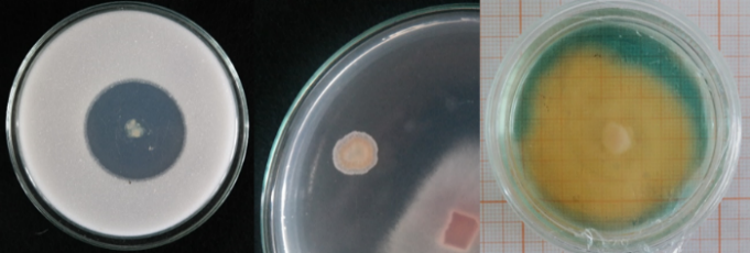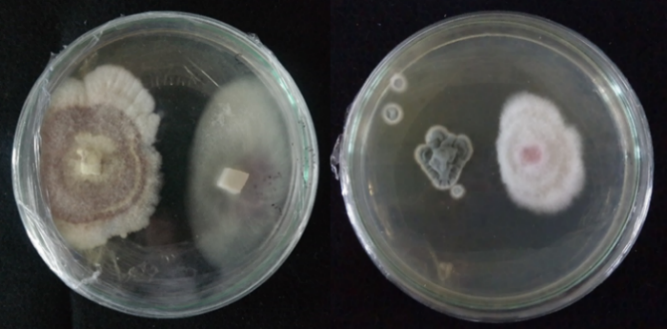 Aspergillus terreus ha sido encontrado como antagonista de Fusarium oxysporum en estudios anteriores: Dawood & Mohamed (2015) estudiaron tres aislamientos de A. terreus como control biológico, los cuales inhibieron hasta un 89% el crecimiento de F. oxysporum por interacción dual; Bashar & Chakma (2014) evaluaron colonias de A. terreus que inhibieron a F. oxysporum mediante interacción dual y producción de metabolitos no volátiles en un 53.33% y 83.33%, respectivamente. Estos trabajos respaldan lo encontrado en nuestra cepa de A. terreus, pues llegó a inhibir el crecimiento del patógeno en 74%, valor similar a lo descrito anteriormente. Quiroz et al. (2008) indica que Aspergillus muestra mecanismos antagónicos de competencia por espacio y producción de sustancias antibióticas denotadas por el cambio de coloración en el medio. Se puede inferir que A. terreus presenta estos dos tipos de acción frente al patógeno.