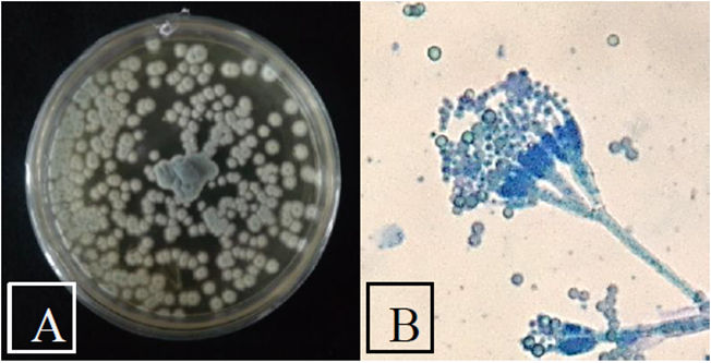 Las características macro y microscópicas de la cepa N°134 se muestran en la Figura 3. Se observa que esta cepa es de textura aterciopelada-arenosa, es de color marrón en el centro y blanco en los bordes cuando es joven, pero totalmente marrón cuando crece. Llega a medir 4 cm de diámetro a los seis días de incubación en agar OGY y presenta un ligero pigmento amarillo en el medio. A 100X, se observan un conidióforo con vesícula globosa y cabeza conidial en forma de abanico levemente columnar, conidios globosos, ausencia de ascas y ascosporas. Estas características concuerdan con un estudio de hongos filamentosos en suelo de páramo (Arias & Piñeros, 2008), donde se describen a las colonias de Aspergillus terreus como aterciopeladas, de color rosado parduzco que alcanzan un diámetro de 3.5- 5 cm en 7 días, con exudado incoloro y producción de un pigmento amarillo difusible en el medio. Además, comparando nuestros datos con las claves taxonómicas descritas por Gómez (1951) y Piontelli (2008), se puede afirmar que la cepa Nº 134 es identificada como Aspergillus terreus.