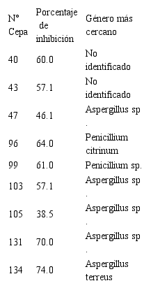 De un total de 143 aislados, sólo 9 inhibieron el crecimiento de Fusarium oxysporum. Los porcentajes de inhibición de estas nueve cepas se observan en la Tabla 1.