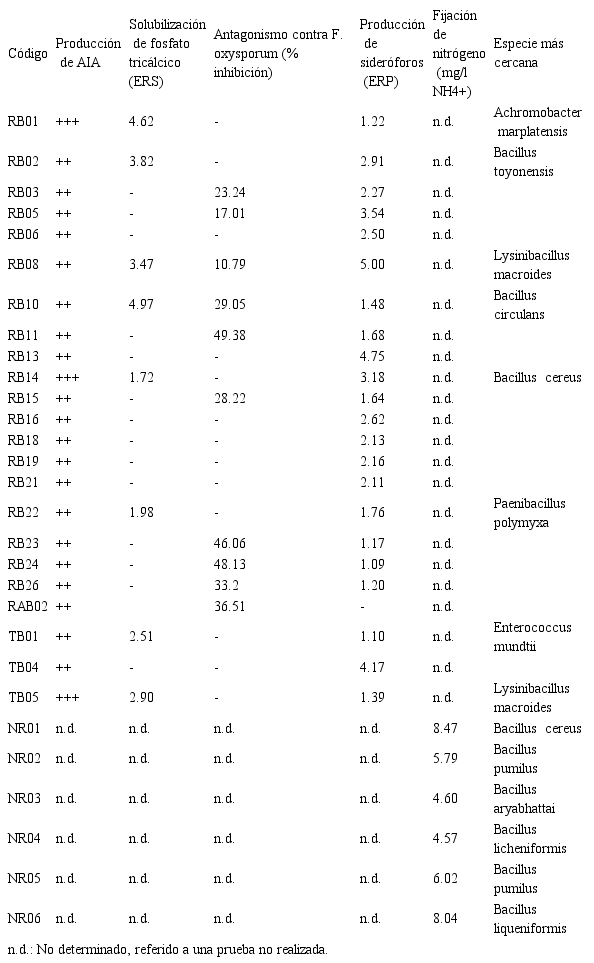 La prueba de producción de AIA fue un tamizaje para reducir los 184 aislamientos obtenidos de raíces, tallos y rizósfera. Fueron seleccionados 36, por mostrar resultados positivos en la producción de indol y con estas cepas se realizaron las siguientes pruebas PGPR donde: 8 mostraron capacidad para solubilizar fosfatos tricálcicos, 10 mostraron capacidad antagónica contra Fusarium oxysporum y 35 produjeron sideróforos. Se descartaron aquellas cepas que no solubilizaron fosfato tricálcico ni mostraron antagonismo contra el patógeno y cuya producción de sideróforos (ERP) fue menor a 2. La fijación in vitro de nitrógeno se realizó sólo en las 6 cepas provenientes de nódulos y todas resultaron positivas, con una fijación en el rango de 4.6 – 8.5 mg/l NH4+. En la Tabla 2, se observan los resultados de las pruebas PGPR de estos aislamientos.