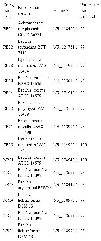 La identificación molecular se realizó en aquellos aislados que presentaron la producción de AIA y solubilización de fosfatos simultáneamente (8 aislados), y a todas las cepas de nódulos (6 aislados). El análisis comparativo de las secuencias de la región 16S del ADNr obtenidas con aquellas registradas en la base de datos de NCBI mostró que de los 14 aislados, 9 pertenecían al género Bacillus, 2 al género Lysinibacillus, 1 al género Paenibacillus, 1 al género Enterococcus y 1 al género Achromobacter (Tabla 3).
