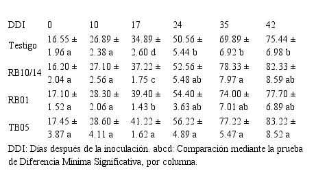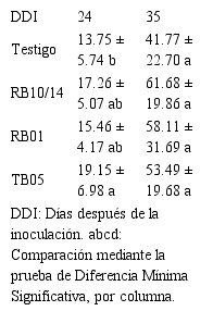 En la evaluación realizada a los 42 días (p = 0.096), aunque no se observaron diferencias significativas en altura de planta, TB05 mostró valores más altos en comparación a los otros tratamientos, siendo un 11% superior al control. El tamaño de la inflorescencia en las plántulas también fue evaluado en dos ocasiones. A los 24 días (p = 0.218) se observó que los tratamientos mostraron inflorescencias de mayor longitud que el control, pero sólo TB05 logró valores superiores con un promedio de 19.1 mm en comparación al testigo quien obtuvo un promedio de 13.7 mm. A los 35 días (p = 0.334), el inóculo mixto (RB10/14) logró el mayor promedio de longitud (61.8 mm), sin embargo, ninguno de los tratamientos mostró significancia estadística respecto al control, cuyo valor promedio de longitud fue 41.7 mm.