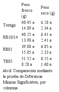 La selección de los inoculantes se realizó a partir de los 23 aislados descritos en la Tabla 2. La cepa con mayor producción de AIA fue RB14 y la más solubilizadora de fosfato fue RB10, ambos formaron parte de la co-inoculación. El tercer tratamiento fue RB01 por ser la cepa rizosférica con los valores más altos en solubilización de fosfato y producción de AIA, simultáneamente. Por último, el cuarto tratamiento fue TB05, como la cepa endofítica con más alto valor en solubilización de fosfatos y producción de sideróforos. Las variables evaluadas fueron altura de planta (Tabla 4), longitud de inflorescencia (Tabla 5), peso fresco y seco (Tabla 6).