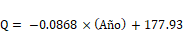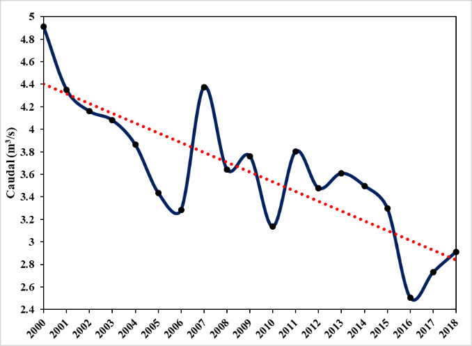 La tendencia anual del caudal medio anual (Q) en la microcuenca, desde el año 2000 al 2018, sigue el comportamiento del modelo determinado por la Fórmula 1, conforme se muestra en la Figura 10. En el año 2000 el valor medio del caudal fue de 4.33 m./s y en el 2018 fue de 2.77 m./s. Siguiendo el comportamiento de la línea de tendencia anual, desde el 2000 al 2018, el caudal medio anual de salida disminuyó en 1.56 m./s, equivalente al 36.1% con respecto a su valor inicial, en 19 años, lo cual justifica una variación considerable de algunos parámetros hidrológicos y climáticos, como la disminución de la precipitación, el incremento de la temperatura superficial del suelo, el aumento de la evapotranspiración, la disminución de la cobertura nival o el incremento de la temperatura máxima del aire en la microcuenca Apacheta.