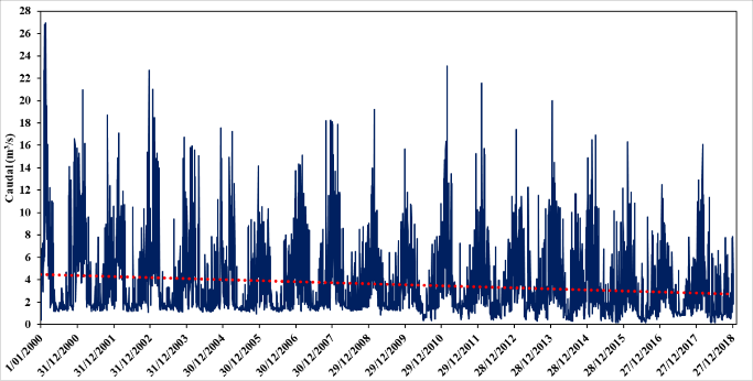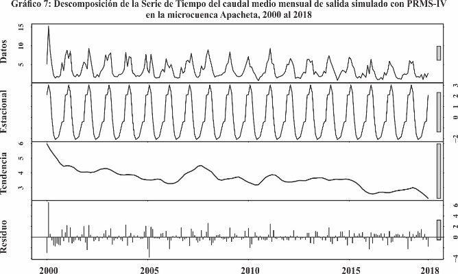 El caudal medio mensual simulado con PRMS-IV en la microcuenca corresponde al aporte de las 31 Unidades de Respuesta Hidrológica (HRUs) que la conforman, cuyos tributarios convergen a la zona más baja de la microcuenca, dando lugar al nacimiento del río Apacheta. En la serie de tiempo de la Figura 7 se observa una pronunciada tendencia negativa del caudal de salida desde enero del año 2000 a diciembre de 2018, lo cual implica una significativa disminución del caudal en los últimos años.
