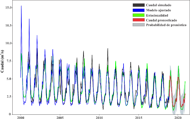 El pronóstico de la serie de tiempo del caudal medio mensual de salida en la microcuenca Apacheta se representa en la Figura 11, donde se observa que los datos ajustados al modelo siguen el comportamiento de la línea de color azul, los datos modelados para el pronóstico siguen la estacionalidad de la línea de color verde, los datos pronosticados desde enero de 2019 hasta diciembre de 2020 siguen el comportamiento de la línea de color rojo y la sombra de color gris corresponde al rango de probabilidad de los datos pronosticados. Así mismo, se observa que el modelo de pronóstico del caudal de salida, de acuerdo con los resultados mostrados en la Figura 11, sigue el mismo comportamiento de la línea de tendencia anual mostrada en la Figura 10. Es importante resaltar que las predicciones se realizan dentro del plazo de 5 años, ya que es el tiempo necesario para la toma de decisiones por parte de las autoridades competentes, priorizando a nivel del Gobierno Regional de Ayacucho una cartera de proyectos relacionados con la siembra y cosecha del agua de acuerdo con el Reglamento de la Ley N° 30215, Ley de Mecanismos de Retribución por Servicios Ecosistémicos (MINAM, 2016), y la priorización de áreas para el programa Sierra Azul.
