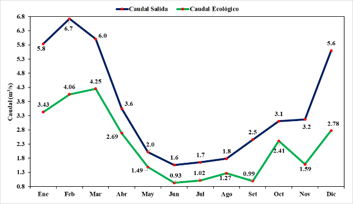 La Figura 12 compara la estacionalidad del caudal de salida en referencia al caudal ecológico de la microcuenca Apacheta; ambos mantienen un patrón similar de comportamiento para los doce meses del año. A pesar de ello, el caudal de salida se acerca al caudal ecológico en los meses de mayo, junio, julio y agosto, lo cual indica que en estos meses el caudal de salida es muy bajo, con una tendencia de escasez de agua, ya que estos meses corresponden al estadío seco. La determinación del caudal ecológico garantiza un caudal necesario para la conservación de la biodiversidad y el mantenimiento de los ecosistemas de la microcuenca. Considerando que la bocatoma Apacheta fue construida en el año 1985, no tiene las consideraciones de los parámetros impuestos en la normativa de la Resolución Jefatural 267-2019-ANA, (ANA, 2019), lo cual evidencia la no sostenibilidad del trasvase a la presa de Cuchoquesera, siendo preocupante en los últimos años, tal como se demuestra en la evaluación de la tendencia anual y el pronóstico del caudal de salida en la microcuenca Apacheta.