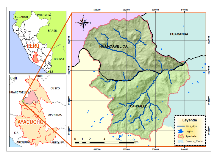 La microcuenca Apacheta es cabecera de la cuenca Cachi, en el distrito de Paras, provincia de Cangallo, Región Ayacucho, Perú, con longitudes de 74º 37' 26.4" W a 74º 45' 32.4" W y latitudes de 13º 17' 6" S a 13º 26' 9.6" S. La línea limítrofe mostrada en la Figura 1 separa el área sur en verde claro perteneciente a la Región Ayacucho del área norte en verde oscuro perteneciente a la provincia de Huaytará de la Región Huancavelica. Tiene un área de 14 348.21 ha, su elevación mínima es de 4 112 msnm, su elevación máxima de 5 045 msnm, y su elevación media es de 4 651 msnm (Pereda et al., 2018). Se caracteriza por tener tres estadíos climáticos, el lluvioso con valores altos de precipitación, temperatura mínima del aire y humedad; el estadío seco, con valores altos de velocidad del viento y bajos de temperatura mínima del aire; el estadío intermedio, con valores altos de temperatura máxima del aire y radiación solar, con valores medios de precipitación 71.09 mm, temperatura máxima del aire 12.73 °C, temperatura mínima del aire -0.35 °C, velocidad del viento 2.91 m/s y radiación solar 514.43 Ly (Moncada et al., 2020).