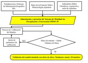 El modelo PRMS-IV es un sistema de modelado basado en procesos físicos, determinista y de parámetros distribuidos, desarrollado para evaluar la respuesta de varias combinaciones de clima y uso de suelo en la hidrología de cuencas hidrográficas, originalmente descrito por Leavesley et al. (1983); simula procesos del ciclo hidrológico, que incluyen el caudal de salida, la evapotranspiración potencial, escorrentía, infiltración e interflujo estimados del balance de masa y energía a partir de datos de cobertura de vegetación, cobertura nival, zona de suelo e información climática, distribuida en 31 unidades de respuesta hidrológica (HRU). Los datos de entrada al modelo PRMS-IV son valores diarios de precipitación, velocidad del viento, temperatura máxima y mínima del aire y datos de caudal de la estación hidrometeorológica Apacheta. También se requieren datos diarios de radiación solar de onda corta extraídos del sistema de asimilación de datos terrestres globales versión 2 (GLDAS-2) de la plataforma Giovanni NASA. El esquema de la Figura 2 muestra la metodología a seguir para determinar el balance de masa con el modelo PRMS-IV.