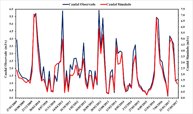 En complemento a las pruebas de validación de la Tabla 3, se compararon los datos del caudal de salida simulado con el caudal observado o medido en el punto de aforo en la bocatoma Apacheta, tal como se muestra en la Figura 3. Se observa que ambos guardan correspondencia en su comportamiento y un buen ajuste para fechas diferidas del año 2009 al 2017.