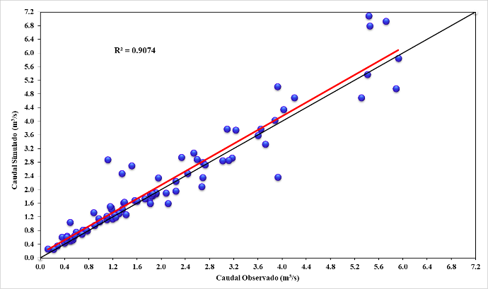 La validación del caudal de salida simulada se da en relación con los datos de aforo del caudal observado de manera gráfica, conforme se muestra en la Figura 4. La correlación lineal se establece mediante un coeficiente de determinación R. = 0.91, lo cual significa que los datos del caudal observado explican en un 91% al caudal de salida simulado con PRMS-IV. Esta aseveración, en adición a las pruebas de validación de la Tabla 3, es suficiente para afirmar que el modelo funciona correctamente y que el resultado es válido con una ligera sobre estimación del caudal simulado con respecto al observado, en relación con la línea de tendencia.