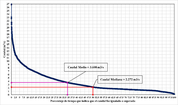 Para la determinación del caudal medio, se calculó el volumen debajo de la curva de duración del caudal con el código Matlab (Apéndice 1), a partir de la serie de tiempo del caudal simulado con PRMS-IV en la microcuenca Apacheta.