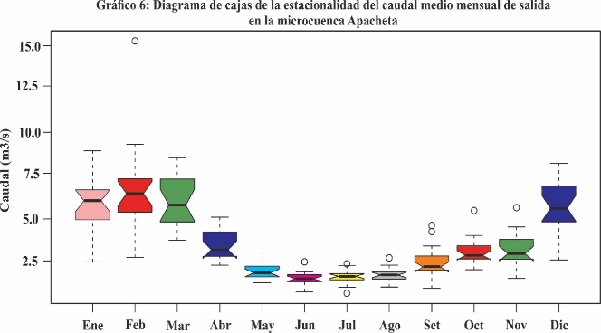 En la Figura 8 se muestra el diagrama de cajas del caudal medio mensual de salida en la microcuenca, desde el año 2000 al 2018. En ella se observa la distribución estacional del caudal medio mensual, el mismo que muestra caudales con mayor afluente en los meses de diciembre, enero, febrero y marzo, que corresponden a los meses del estadío lluvioso; los valores atípicos de hasta 15 m./s se deben a precipitaciones intensas fortuitas. El caudal medio mensual de salida con menor valor se da en los meses de mayo, junio, julio y agosto, con valores atípicos de hasta 2.5 m./s y corresponden a meses de un estadío seco, con precipitaciones de tipo nival (Moncada et al., 2020).