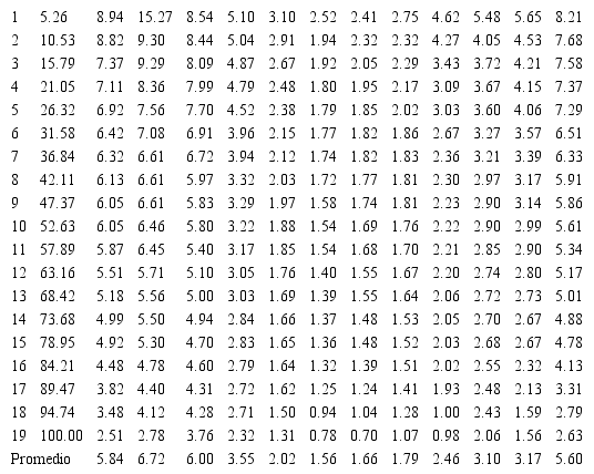 En la Tabla 1 se muestra la plantilla de cálculo del caudal ecológico para los N = 19 años de datos de caudal medio mensual simulados, del año 2000 al 2018. En la segunda columna se observan las probabilidades calculadas con: P(%) = (m/N)×100, ordenadas de menor a mayor, correspondientes a los caudales medios para cada mes de mayor a menor (ANA, 2019).