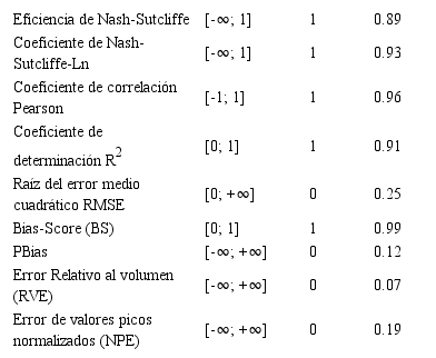 El caudal de salida simulado se validó con datos de aforo medidos en la coordenada UTM, latitud 539857 m y longitud 8524841 m, en la bocatoma Apacheta, desde el 27 de marzo de 2009 al 17 de mayo de 2017, con un promedio de 9 a 10 datos por año, haciendo un total de 85 datos. El grado de confiabilidad del caudal simulado se determinó calculando la eficiencia de Nash-Sutcliffe, el coeficiente de Nash-Sutcliffe-Ln para los valores del logaritmo (Krause et al., 2005), el coeficiente de correlación de Pearson, el coeficiente de determinación R., la raíz del error medio cuadrático (RMSE), Bias Score (BS), PBias, el error relativo al volumen (RVE) y el error de valores picos normalizado (NPE) (Nash & Sutcliffe, 1970; Krause et al., 2005).