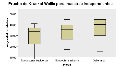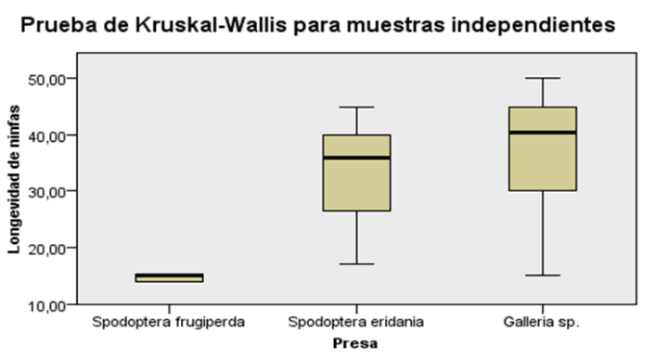 A través de prueba de Kruskall-Wallis (p = 0.05), se determinaron diferencias significativas para el estadío ninfal y longevidad de adultos de P. nigrispinus. Para las ninfas que tuvieron como presa a S. frugiperda se determinó un periodo significativo más corto de duración de su estado ninfal comparado con el resto de grupos, no existiendo diferencias entre los grupos de S. eridania . Galleria sp. (Figura 5). El grupo de S. frugiperda presentó una baja dispersión de datos, siendo la desviación estándar de 0.50.
