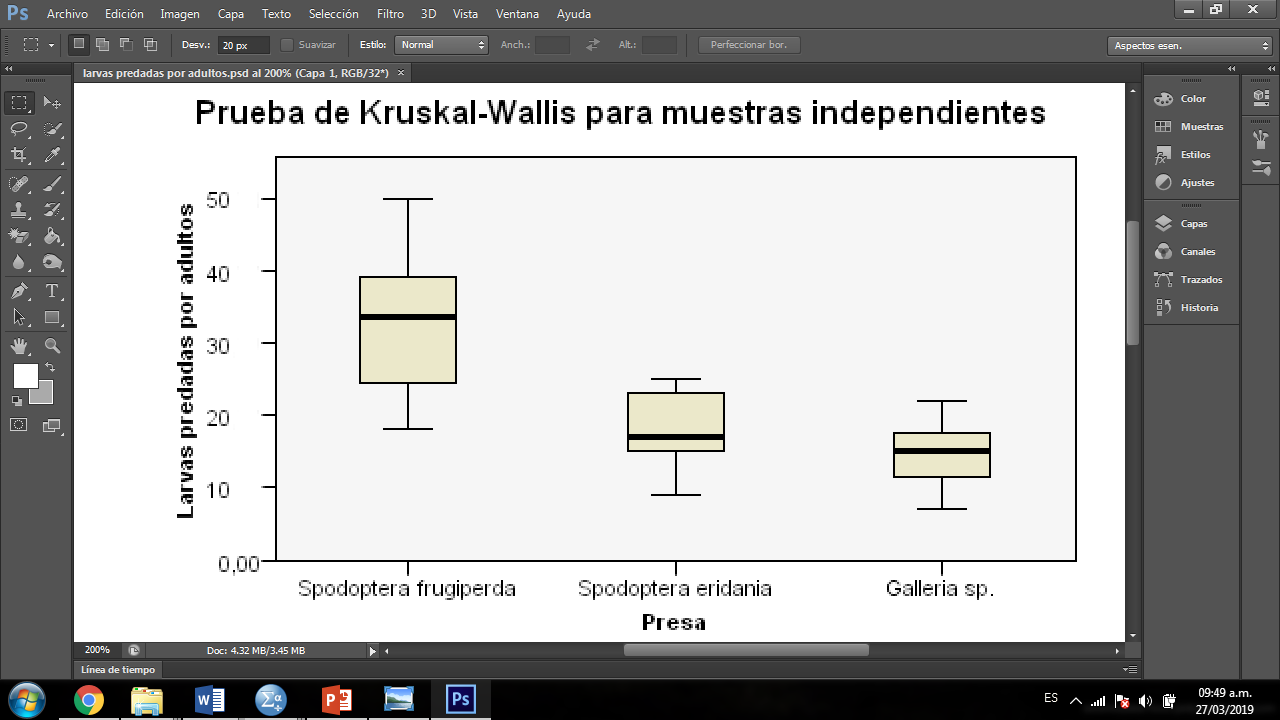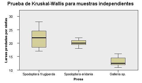 Para el caso de larvas predadas por ninfas se utilizó la prueba de Kruskal-Wallis (p = 0.05), donde S. frugiperda fue la presa y P. nigrispinus tuvo mayor actividad predadora (21.90 larvas consumidas), caso contrario, Galleria sp. fue la presa donde se registró menor actividad predadora (13.05 larvas consumidas) (Figura 7).