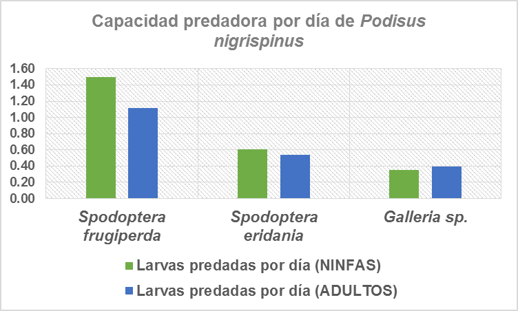 La mayor capacidad predadora fue observada en ninfas, superando a los adultos. Se registraron 21.90, 20.2, y 13.05 larvas consumidas por ninfas de P. nigrispinus sobre S. frugiperda, S. eridania . Galleria sp., respectivamente; mientras, en los adultos se registraron 32.8, 18.1, y 14.55 larvas consumidas. Las ninfas son más voraces que los adultos teniendo como presa a S. frugiperda y S. eridania.